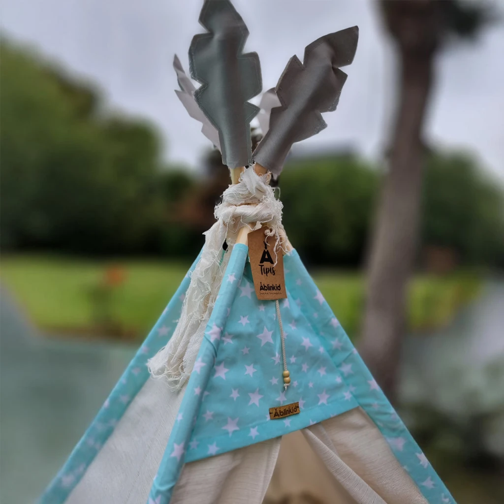 Confeccionados en tela de tapicería en crudo, combinada con estampado estrellas aqua