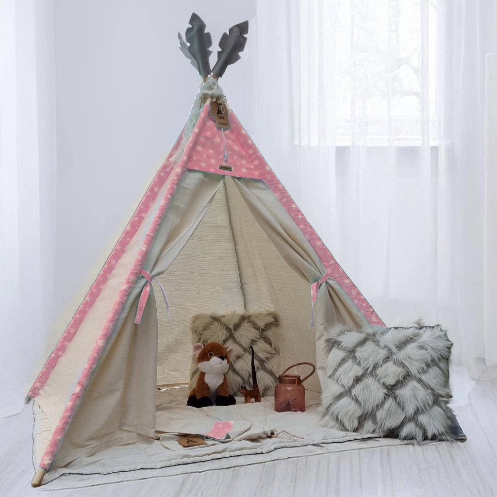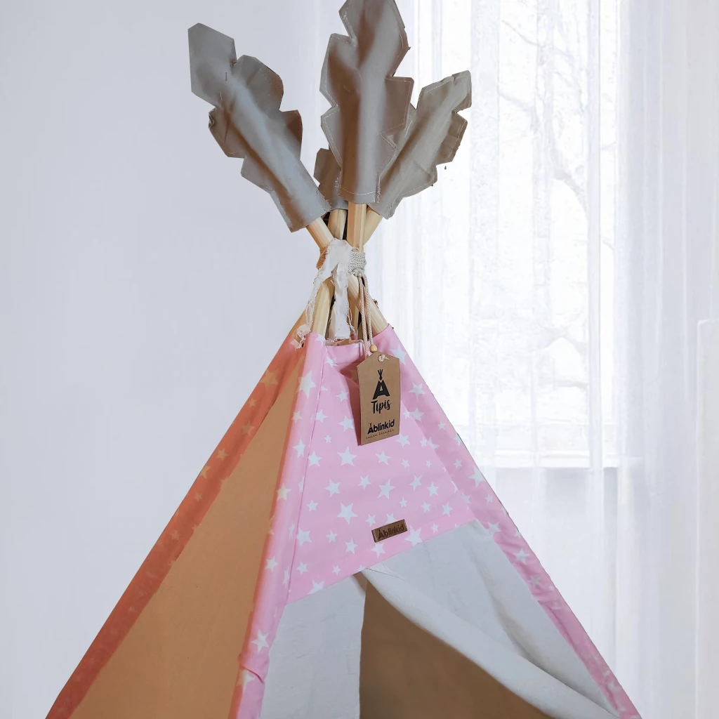 Confeccionados en tela de tapicería en crudo, combinada con estampado estrellas rosa