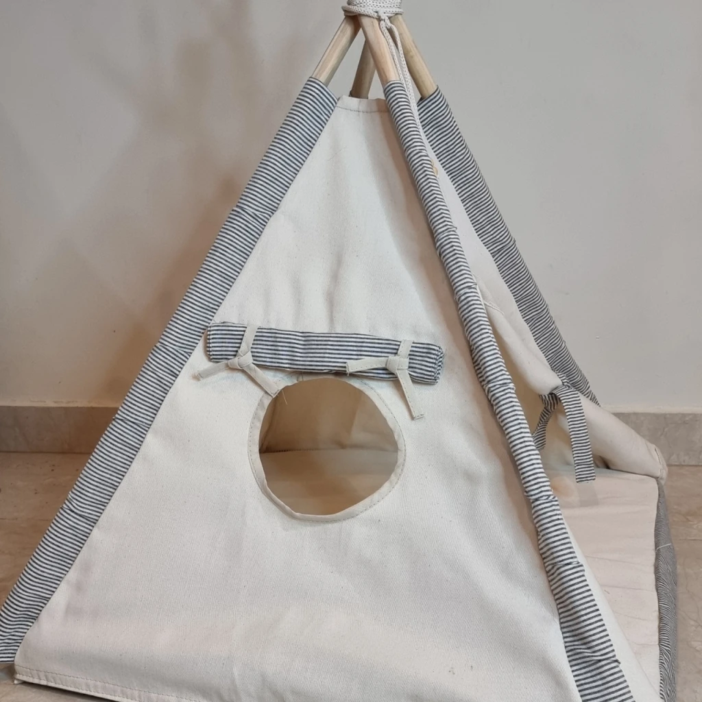 Confeccionado en de gabardina color crudo, combinado con rayas color gris.