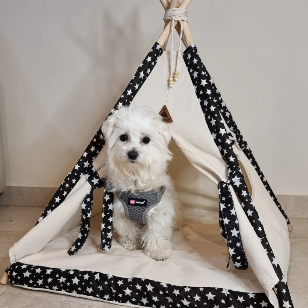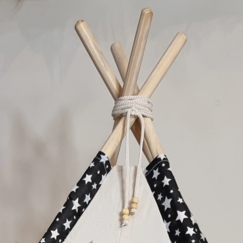 Confeccionado en de gabardina color crudo, combinado con restrellas